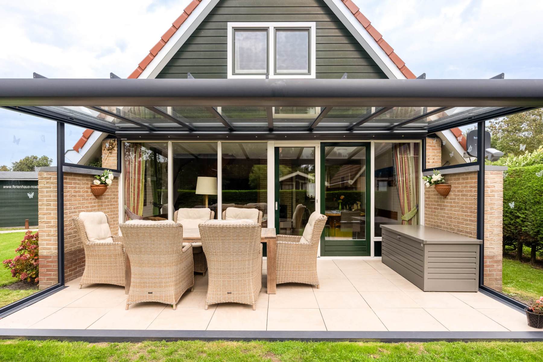 Terrassenüberdachung mit elektrischer Markise: „Entspannung pur bei jedem Wetter: Genießen Sie Ihre private Terrasse mit hochwertiger Überdachung und elektrischer Markise – ideal für gemütliche Stunden im Freien, auch bei einem Regenschauer.
